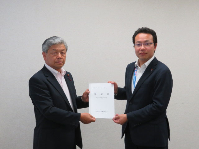 令和4年6月29日、千葉県町村議会議長会は、令和4年度千葉県町村議会議長会第1回定例会において採択した千葉県への要望事項を、鳴田真也千葉県総務部市町村課長に提出した。