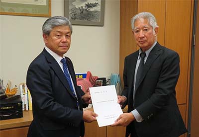 森英介・衆議院議員(右)に要望書を提出する松野会長